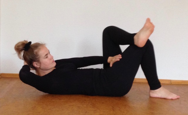 In Rückenlage nehme die rechte Hand hinter den Kopf. Dein linker Unterschenkel ist am rechten Bein aufgestellt. So liegend atme ein. Ausatmend hebe den Oberkörper schräg ab und drücke mit der linken Hand gegen den rechten Oberschenkel.